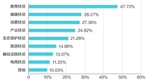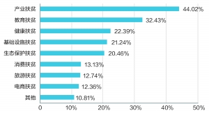 在私募股权投资基金管理人中,开展精准扶贫项目最集中的三个领域分别是产业扶贫(占比44.02%)、教育扶贫(占比32.43%)、健康扶贫(占比22.39%)。在私募证券投资基金管理人中,开展精准扶贫项目最集中的三个领域分别是教育扶贫(占比47.72%)、健康扶贫(占比28.27%)、消费扶贫(占比27.36%)。行业机构开展精准扶贫领域广泛,内容丰富,展示了多样化的扶贫手段与方式。