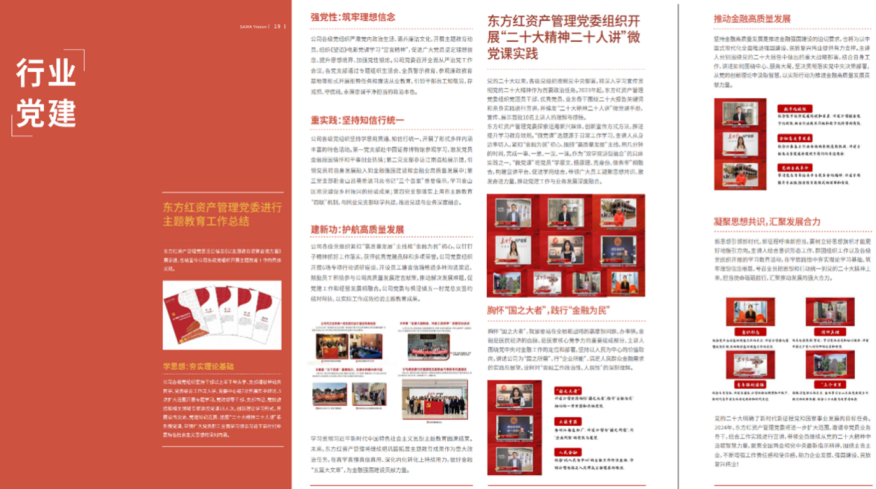 发挥党组织的政治优势和组织优势,精心组织开展各类主题活动,凝聚共识与发展力量。2022年,东方红资产管理以“壮阔东方潮,奋斗创未来”为主题,开展“耕读东方”、“辰启东方”、“锐意东方”和“朗朗东方”等系列主题实践活动,鼓励干部员工提质增效共同奋斗;2023年,开展“以主题教育凝聚奋进力量”主题活动和“二次创业”调研等专项行动,推动党建与业务发展深度融合;2024年,坚持严管与厚爱,印发《党纪学习教育实施方案》,围绕原原本本学《条例》、扎实做好警示教育,将“纪律约束”与“文化浸润”融入企业经营发展全链条。