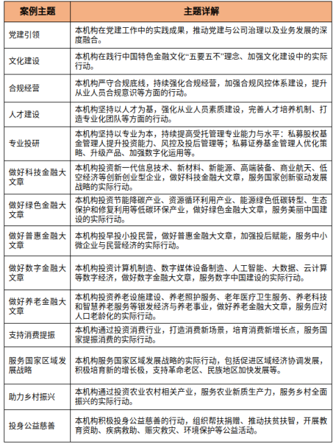 本年度拟围绕党建引领、文化建设、合规经营、人才建设、专业投研,做好金融“五篇大文章”,支持科技创新、支持消费提振、助力乡村振兴、投身公益慈善等主题编选案例。